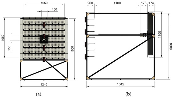 Dimensions of the measurement system in mm: (a) back view of the 3D model of the measurement system; (b) right view of the 3D model of the measurement system.
