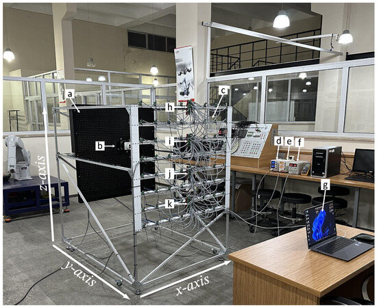 General view of the temperature measurement system: (a) measurement plate; (b) fan heater; (c) 8 × 8 sensor grid; (d) power supply 1; (e) power supply 2; (f) power supply 3; (g) computer (h) LCU1; (i) CCU; (j) LCU2; (k) LCU3.