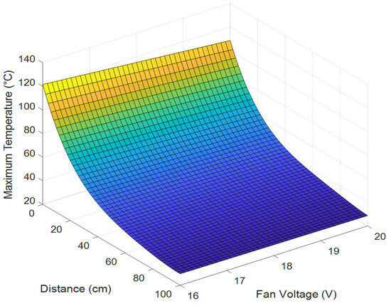 The maximum temperature points for 30 of the 55 measurements listed in Table 2 are shown in Figure 11. As the heater–sensor distance increased, the maximum temperature exponentially decreased. Additionally, as the fan voltage increased, the airflow velocity inside the 81 mm long and 80 mm diameter guide, as seen in Figure 6, also increased. Owing to the increased velocity, the air drawn from the environment left the duct in a shorter time, causing the maximum temperature to decrease. The measured maximum temperature values were consistent with each other in terms of both the heat sensor distance and fan voltage. The maximum temperature value was obtained, as shown in (5), depending on the heater–sensor distance (d) and fan voltage (v) using the “Curve Fitter” application in MATLAB. The equation coefficients are presented in Table 3, and the goodness-of-fit statistics, root mean square error (RMSE) 1.9543, and R-squared (RSQ) 0.9943 were calculated.