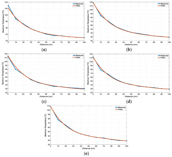 Measured and fitted curves for maximum temperature: (a) fan supply voltage 16 V; (b) 17 V; (c) 18 V; (d) 19 V; (e) 20 V.