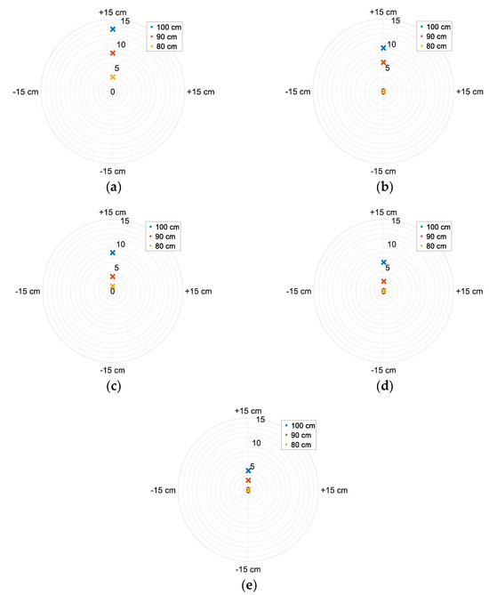 The shift of the maximum temperature point on the y-axis for heater–sensor distances of 80 cm, 90 cm, and 100 cm: (a) fan supply voltage 16 V; (b) 17 V; (c) 18 V; (d) 19 V; (e) 20 V.