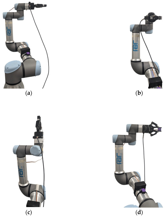 Figure 6. Robotic arm poses at rest (a) and at 90° rotation around x-axis (b), y-axis (c), and z-axis (d).