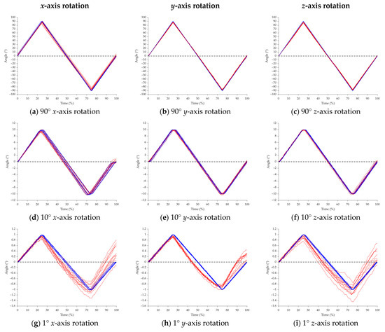 Angle vs. Time plots measured from the IMU sensors (red) and robotic arms (blue), for all twelve trials of the 90° (a–c), 10° (d–f), and 1° (g–i) x-axis rotation, y-axis rotation, and z-axis rotation tests.