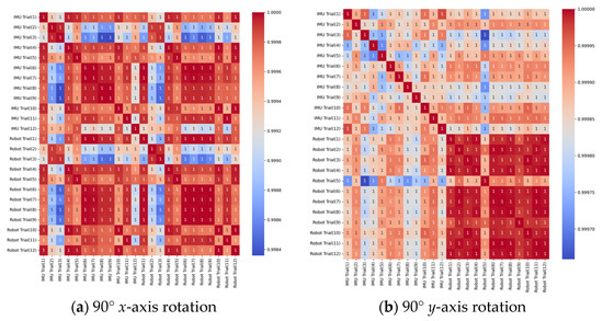 Correlation heatmaps for all twelve trials of the (a) 90° x-axis and (b) 90° y-axis rotation tests.