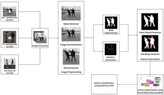 Subsequent steps involve generating skeletal representations of the segmented silhouettes and extracting key points corresponding to major body parts such as the head, torso, arms, and legs. These key points enable the capture of detailed spatial and temporal features that are essential for accurately distinguishing between activity classes. The extracted features are then optimized by reducing their dimensionality in order to lower computational costs and enhance efficiency, ensuring that only the most informative and discriminative features are retained.