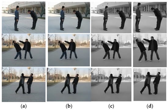 Illustration of the preprocessing stage: (a) original image; (b) noise removal; (c) image normalization; (d) ROI extraction over push activity on BIT interaction dataset.