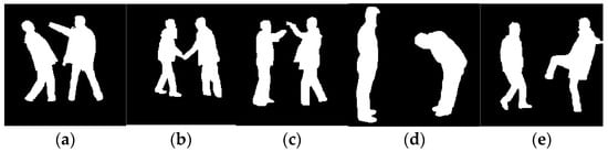 GrabCut segmentation results of (a) punch, (b) handshake, (c) high five, (d) bend, and (e) kick activities.