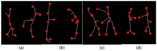 Skeleton and key point generation on (a) kick, (b) bend, (c) punch, and (d) handshake activities.