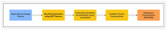 The point-based feature extraction process involves multiple stages designed to capture spatial and temporal information critical for recognizing human activities. Initially, the MOCON technique is used to represent movement contexts at the individual, local, and global levels by computing centroids and gradient vectors. These centroids summarize the spatial relationships between interacting entities in each video frame. The gradient vectors capture the motion of key points relative to these centroids, forming histograms that describe the activity’s overall motion patterns. This hierarchical approach ensures that the model captures both fine-grained and broad movement characteristics. The flow chart in Figure 5 below illustrates the flow of MOCON construction: