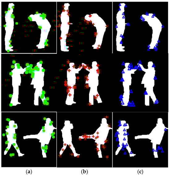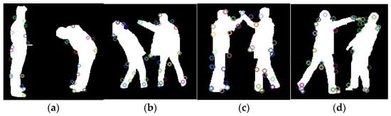 MOvement CONtexts (MOCONs) [] are a spatial distribution of the local movements of the interest points. They capture the individual, local, and global movement contexts to construct a point-based feature representation of human activity. Firstly, the interest points are extracted using the SIFT algorithm along with optical flow []. The SIFT algorithm allows extraction of the interest points, whereas optical flow allows tracking of those interest points along the image sequence based on the smallest Euclidean distance between the SIFT features in an image sequence [,,]. Figure 6 illustrates extracted SIFT features.