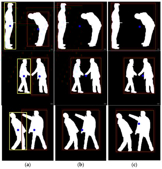 Once the interest points are extracted, the next step is to construct the MOCONs, for which the context of local movements on three different levels, i.e., individual, local, and global, are calculated []. Initially, three reference points pi, pL and pG are calculated. These three reference points are the centroids of the individual, local, and global movements. To obtain the individual reference point, the center position of the bounding box is calculated for each human silhouette i at time t, respectively; this can be denoted by following equation: