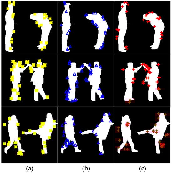 Illustration of (a) Identical, (b) enclosed, (c) double features on bend, high five, and kick activities.
