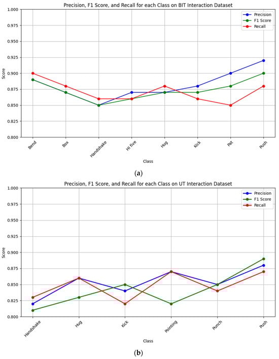 In Figure 17, line graphs were used to visualize the F1 score, recall, and precision across the BIT Interaction, UT Interaction, NTU RGB + D 120, and PKU MMD datasets. This visualization highlights the comparative performance of the proposed model, providing a clear overview of its effectiveness across diverse datasets and performance metrics.