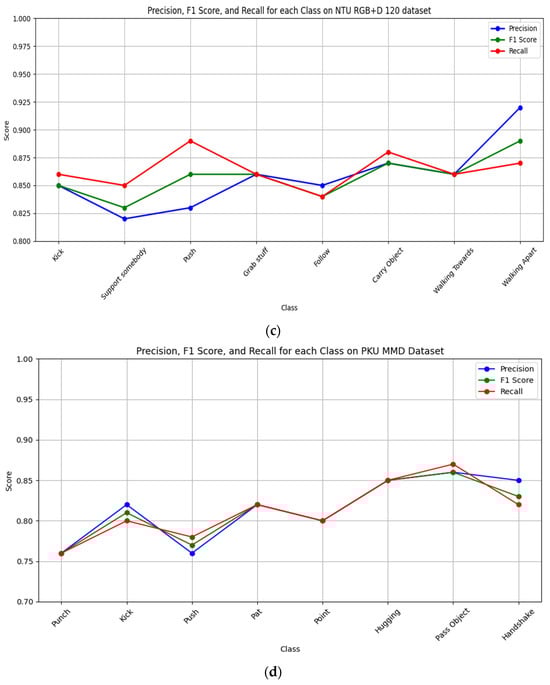 Line graph displaying F1 score, Recall, and Precision on (a) BIT interaction, (b) UT interaction, (c) NTU RGB + D 120, and (d) PKU MMD dataset.