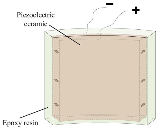 Piezoelectric ceramic materials are generally used in transmitting transducers in ALWD tools to achieve energy conversion between electricity and sound. Such transducers generally comprise four arc-shaped piezoelectric vibrators, and each vibrator must be encapsulated in epoxy resin or rubber. Figure 1 shows the configuration of an arc-shaped piezoelectric vibrator after epoxy encapsulation. The polarization of the arc-shaped piezoelectric ceramic was in the radial direction, and the material was PZT-5G. The encapsulated vibrator exhibited a resonance frequency of f0 = 15 kHz under the condition of mechanical freedom in a fluid.