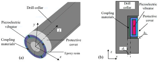 The ALWD tool is an acoustic measurement system based on a thick-walled metal tube structure (drill collar). The design of the WD transmitting transducer is constrained by the specific measurement conditions that it must meet. The transducer is typically mounted on a slotted drill collar. To facilitate installation, piezoelectric vibrators are frequently designed to have an arc shape. The arc-shaped piezoelectric vibrator must be encapsulated to provide electrical insulation and enhance the resilience of the transducer to fluid erosion [6,7]. This type of transmitting transducer is common in the ALWD tools used by numerous oil service companies. Examples include Baker Hughes’ APX and Schlumberger’s Sonic Scope, which employ eight and four arc-shaped piezoelectric vibrators, respectively, to generate the WD acoustic source [8,9]. To optimize the radiation performance of the acoustic source, it is essential to enhance the structural design of the vibrators. The most prevalent numerical simulation approach is the finite-element method (FEM), which considers the structural characteristics of the transducer and the associated electromechanical coupling effects, as well as the coupling between the transducer and surrounding medium [10,11]. The effects of geometry and boundary conditions on the radiation performance of a WD-transmitting transducer have been analyzed using the FEM [12,13,14]. The objective of such numerical simulation studies was to provide a theoretical basis for the dimensional design of arc-shaped piezoelectric vibrators. However, only a few studies have considered the impact of the encapsulated structure of the vibrator on the radiation performance of the transducer [13,15]. In addition to the encapsulated structure, the acoustic performance of the transducer can be affected by the mounting method. This encompasses the coupling material between the drill collar and transducer, the structure of the drill collar, and the protective cover, which influence the radiation characteristics of the WD transmitting transducer, constituting a gap in the existing literature.