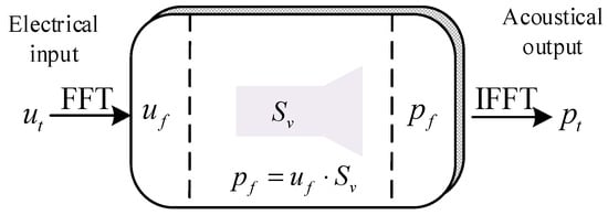 This paper proposes a computational method for calculating the transient radiated acoustic pressure signal of a transducer based on the complex transmitting voltage response. The proposed method can be employed to rapidly calculate the transient response of the transducer, as it only involves the fast Fourier transform (FFT). The fundamental premise of this methodology is that the transmitting transducers can be conceptualized as a linear, time-invariant system that modulates the complex amplitude of each frequency component of the input excitation voltage signal to generate an acoustic pressure signal output (Figure 4). This assumption is only applicable when the amplitude of the excitation voltage signal is small and the temperature and pressure are stable [19,20]. The frequency response of the system is defined as the complex transmitting voltage response (Sv). The magnitude of the Sv is referred to as the system gain, and the phase of the Sv is designated as the phase shift of the system. Consequently, the far-field radiated acoustic pressure waveform of the transmitting transducer was calculated using the Sv, which transformed the excitation voltage signal ut input to the system into an output acoustic pressure signal pt: