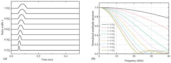 AL frequently employs a rectangular pulse excitation signal to stimulate the transducer, in conjunction with a transformer to augment the excitation power. This can generate high voltages in thousands of volts [21]. The rectangular pulse excitation signal with a pulse width of τ was transformed by the transformer into a sinusoidal signal with a similar half-period [22,23]. The time- and frequency-domain expressions for a half-sine pulse signal are as follows: