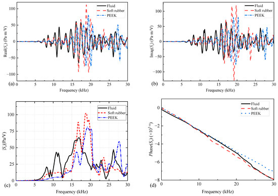 Real (a), imaginary (b), magnitude (c), and phase (d) versus frequency curves of the complex transmitting voltage response (Sv) of the while-drilling monopole acoustic source when the coupling materials between the encapsulated piezoelectric vibrator and drill collar differed.
