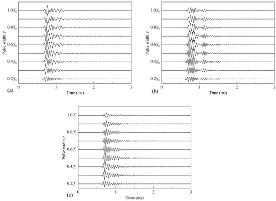 Acoustic pressure signals radiated by a while-drilling monopole acoustic source driven by half-sine excitation voltage signals with different pulse widths with coupling materials being a fluid (a), soft rubber (b), and PEEK (c).