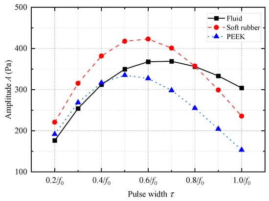 where T1 and T2 are the start and end moments of the waveform window, respectively, and N is the number of waveform sample points in the time window. The range of the acoustic pressure waveform window during the calculation was 0~2 ms. As shown in Figure 8, the amplitude of the acoustic pressure signals emitted by the monopole acoustic source tended to first increase and then decrease with an increase in the pulse width. The amplitude of the radiated acoustic pressure waveform of the WD monopole acoustic source with coupling materials of fluid, soft rubber, and PEEK reached its maximum when the pulse width τ of the half-sine excitation signal was 0.7/f0, 0.6/f0, and 0.5/f0, respectively.