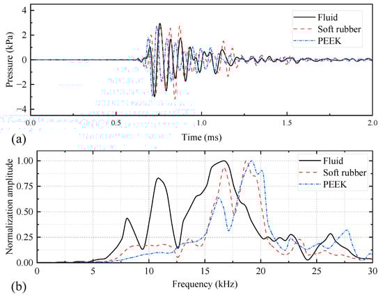Waveforms (a) and spectra (b) of acoustic pressure radiated at (1, 0, 0) m from while-drilling monopole acoustic sources with different coupling materials, driven by a voltage signal with a pulse width of 0.6/f0.