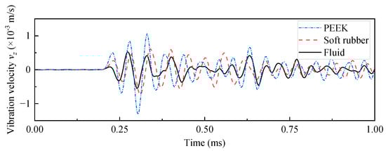 Waveforms of axial vibration velocity at the surface of the drill collar (0.1, 0, 0.9) m for while-drilling monopole acoustic source with different coupling materials, driven by a voltage signal with a pulse width of 0.6/f0.