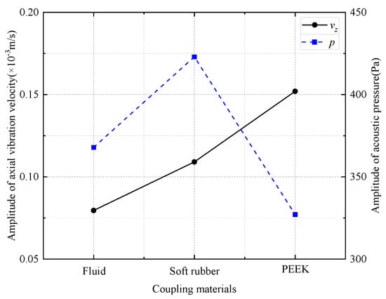 Curves of radiated acoustic pressure amplitude and axial vibration velocity waveform amplitude for different coupling materials.