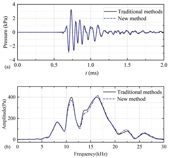 Waveforms (a) and spectra (b) of acoustic pressure generated by a half-sine excitation voltage signal with a pulse width of 0.7/f0 exciting a while-drilling monopole acoustic source at the spatial coordinates (1, 0, 0) m (with fluid as a coupling material) computed using two different methods.