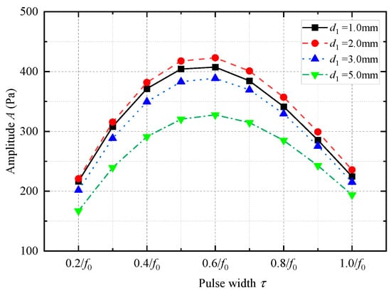 The acoustic pressure signals emitted by the WD monopole acoustic source are related to the transmitting voltage response and excitation voltage signal of the source. Using Equation (5), the acoustic pressure signals radiated by the WD monopole acoustic source with different coupling materials under the excitation of half-sine voltage signals with different pulse widths were calculated, and the results are shown in Figure 7. The radiated acoustic pressure waveforms generated by the WD monopole acoustic source with different coupling materials exhibited considerable morphological differences. The waveforms of the radiated acoustic pressure waveforms from the WD monopole acoustic source were similar to Ricker signals with a longer tail when fluid was used as the coupling material. However, when soft rubber was used as the coupling material, the waveforms of the radiated acoustic pressure from the WD monopole acoustic source resembled four-period cosine envelope signals. Figure 8 shows the variation curve of the radiated acoustic pressure waveform amplitude A of the WD monopole acoustic source as a function of the half-sine excitation pulse width τ. The waveform amplitude A was defined as follows: