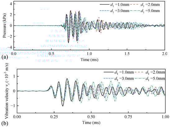 Radiated acoustic pressure waveforms (a) recorded at spatial coordinates of (1, 0, 0) m, and axial vibration velocity waveforms (b) recorded at coordinates of (0.1, 0, 0.9) m on the drill-collar surface when the thicknesses of the coupling material, d1, varied.