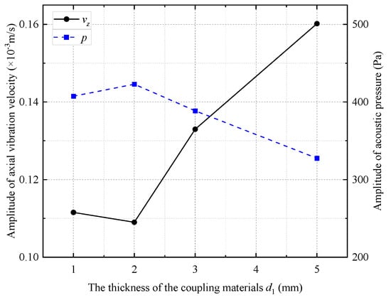 Curves of radiated acoustic pressure amplitude and axial vibration velocity waveform amplitude with the thickness of coupling materials.