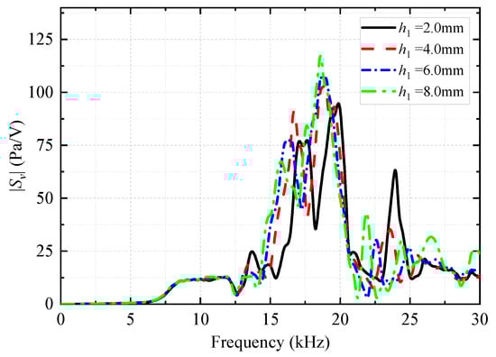 The height (h1) of the coupling materials between the upper and lower bottom surfaces of the encapsulated vibrator and drill collar was changed (the height of the grooves of the drill collar was changed). The coupling material (soft rubber) between the transducer and drill collar in Figure 3 remained unchanged. The effect of the height h1 of the coupling materials on the radiation performance of the WD monopole acoustic source was analyzed. Figure 17 shows the variation in the transmitting voltage response of the WD monopole acoustic source with frequency at varying heights of the coupling materials. With an increase in the height of the coupling materials, the peak amplitude of the transmitting voltage response gradually increased, and the peak of the spectrum gradually shifted toward low frequencies.