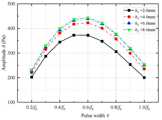 Variation in the amplitude of the radiated acoustic pressure waveform of the while-drilling monopole acoustic source with the pulse width of the excitation voltage signal τ with respect to changes in the height of the coupling material (soft rubber).