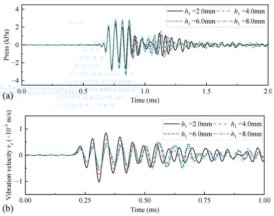 Radiated acoustic pressure waveforms (a) recorded at spatial coordinates of (1, 0, 0) m, and axial vibration velocity waveforms (b) recorded at coordinates of (0.1, 0, 0.9) m on the drill-collar surface when the height of the coupling material h1 varied.