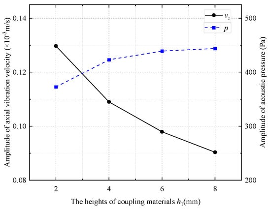 Curves of radiated acoustic pressure amplitude and axial vibration velocity waveform amplitude with the heights of coupling materials.