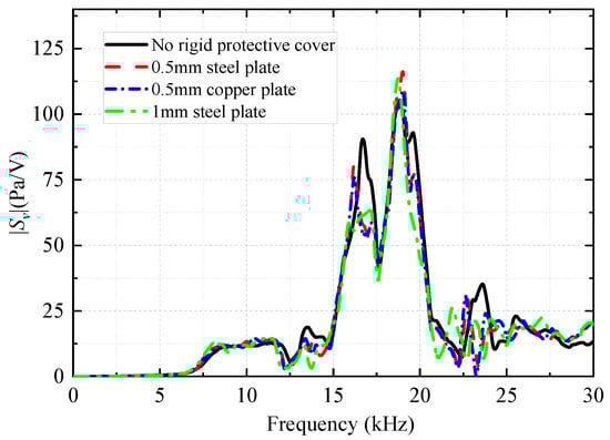 Once the transducer is mounted onto the drill collar, the transducer must be protected from the drilling fluid by fitting a protective sheet metal cover on the outermost side. In the harmonic-response analysis of the WD monopole acoustic source with different thicknesses and materials of the metal plate as the protective cover, the coupling material (soft rubber) between the transducer and the drill collar remained unchanged. The thickness of the coupling materials was set to d1 = 2 mm, and the height of the coupling materials was set to h1 = 4 mm. Figure 21 shows the variation in the transmitting voltage response quantities with frequency for the WD monopole acoustic source with different protective covers.