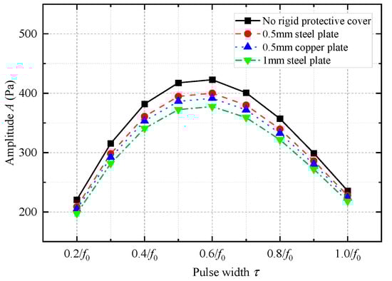 Variation in the amplitude of the acoustic pressure waveform emitted by a while-drilling monopole acoustic source with the pulse width of the excitation voltage signal τ when metal plates of different thicknesses and materials were used as protective covers.