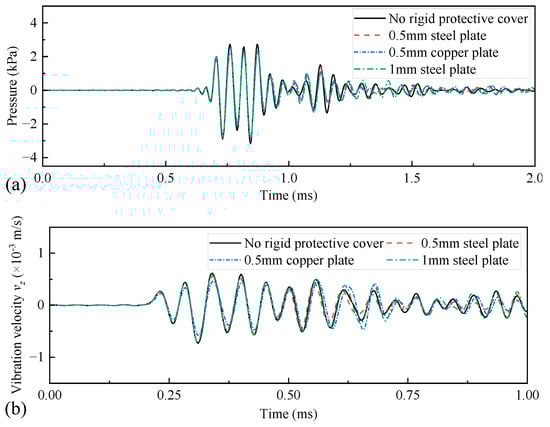 Radiated acoustic pressure waveforms (a) recorded at spatial coordinates of (1, 0, 0) m, and axial vibration velocity waveforms (b) recorded at coordinates of (0.1, 0, 0.9) m on the drill-collar surface when metal plates of different thicknesses and materials were used as protective covers.