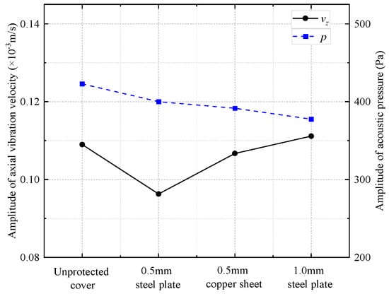 Curves of radiated acoustic pressure amplitude and axial vibration velocity waveform amplitude with the material and thickness of the protective cover.
