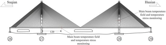 The Huai’an Bridge spans a total length of 2062 m and features a configuration of six lanes in each direction. The main bridge section is designed as a prestressed concrete double-tower, double-surface cable-stayed bridge with a fully floating system, incorporating a span layout of 152 m + 370 m + 152 m. The towers are constructed using a reinforced concrete box structure and were erected through an overturning process, reaching a height of 137.1 m, with two layers of beams positioned between them. Each tower leg is equipped with 31 pairs of cable-stayed cables, resulting in a total of 248 cables for the bridge; the number of steel strands in individual cables varies from 34 to 61. The towers exhibit an “H”-type structure, with upper and middle columns measuring 77 m and 47 m in height, respectively. Given that each tower leg of the Huai’an Bridge receives similar solar radiation, only the upstream tower leg on the Huai’an side has been selected as the primary measurement point for monitoring tower temperature.