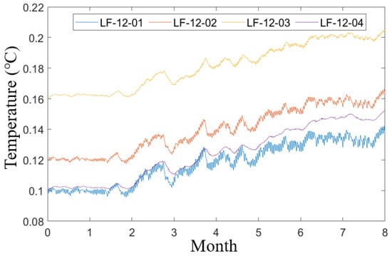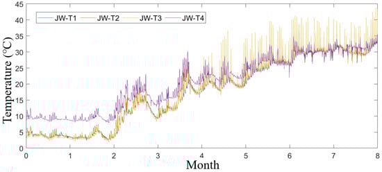 The wavelet packet decomposition technique is widely utilized in signal analysis, demonstrating superior performance in resolving high-frequency components compared to traditional wavelet analysis [21]. By applying wavelet packet decomposition to the original data from each temperature sensor, the resulting temperature data are presented in Figure 3. From January to August, the temperatures measured by each sensor exhibited a gradual increase, with similar trends observed across all sensors. Notably, the temperature recorded by JW-T4 during the first five months was relatively high, while the remaining sensors reported values that were closely aligned with one another. Nevertheless, considering the results of the actual field measurements and the environmental impacts, the trend and distribution of the changes are consistent, and these data are suitable for conducting subsequent studies.