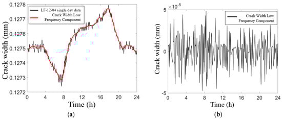 Wavelet packet decomposition of sensor LF-12-04 single-day data: (a) Crack width raw data and low-frequency component. (b) Crack width HF component.