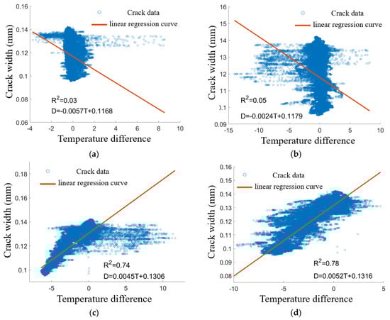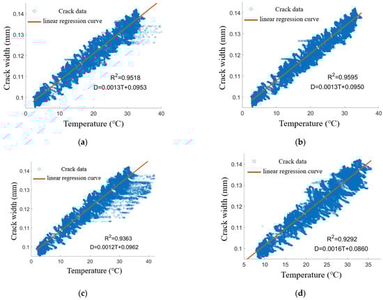 Correlation scatter plot of temperature characteristics with crack width data and one-way linear regression analysis: (a) JW-T1 and LF-12-01. (b) JW-T1 and LF-12-02. (c) JW-T1 and LF-12-03. (d) JW-T1 and LF-12-04.