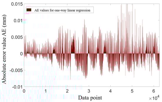 The linear regression equation derived from the temperature data at measurement point JW-T1 to model the thermotropic crack width at measurement point LF-12-02 is expressed as (D = 0.0013 T + 0.0950). This equation can also be utilized to predict the crack width at LF-12-02 based on the temperature data from JW-T1. It was observed that the predicted crack width data for measurement point LF-12-02 closely align with the overall trend of the actual values; however, a significant discrepancy between the predicted and actual values remains apparent. This suggests that relying solely on the goodness-of-fit indicator (R2) for assessing prediction accuracy may not be sufficient. Therefore, to enhance automated detection of anomalous crack widths and improve the real-time accuracy of the evaluation model, the Absolute Error (AE) for each data point will be analyzed. The AE can be calculated using Equation (1):