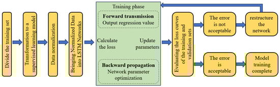 Figure 8 provides a comprehensive flowchart that outlines the training process for the real-time prediction model aimed at estimating the crack width of bridge towers utilizing an LSTM neural network. Initially, the dataset is transformed into a supervised learning format after the construction of both training and testing sets. Concurrently, the temperature feature data and crack width measurements are normalized to ensure consistency and improve model performance. Furthermore, this study employs the Adam optimization algorithm as the gradient descent optimizer, which is specifically designed to enhance convergence efficiency in training deep learning models. In the context of regression analysis, the mean squared error (MSE) between the predicted values and the actual outcomes is typically utilized as the loss metric. This loss metric is mathematically defined by the following formula: