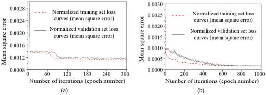 Loss curves of the normalized dataset for the training process of BPNN network and LSTM network: (a) BPNN-5 hidden layers-128 units per layer. (b) LSTM-2 hidden layers-128 units per layer.
