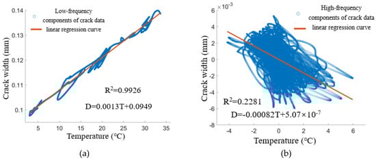 Correlation analysis of high and low frequency components of temperature data and crack width data: (a) Low-frequency component correlation. (b) High-frequency component correlation.