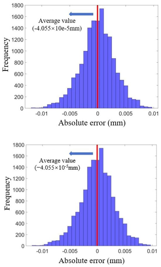 Given that the ideal value of the residual RAD should be zero, two permissible error lines symmetrical to this zero value are defined, as depicted in Figure 15. The values associated with these two symmetric allowable error lines, which encompass 95% of the area of the perceptual domain, are designated as the allowable error based on the 95% confidence level. For the RAD of the unprocessed raw crack data, the allowable error is calculated to be ±0.009 mm.