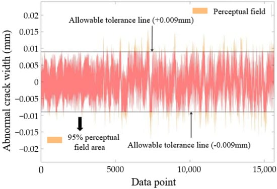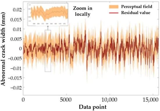 As illustrated in Figure 14, the Residual Absolute Deviation (RAD) calculated from the unprocessed raw data fluctuates around zero. In practical engineering applications, the potential range of anomalous crack width values should be considered as a sensing domain centered on the residual RAD curve, with a width of 0.012 mm (ranging from −0.006 mm to 0.006 mm). To accurately determine the specific anomalous crack width value using the residual RAD, it is essential to establish a definitive value. Consequently, defining the permissible error for the perception domain is crucial.